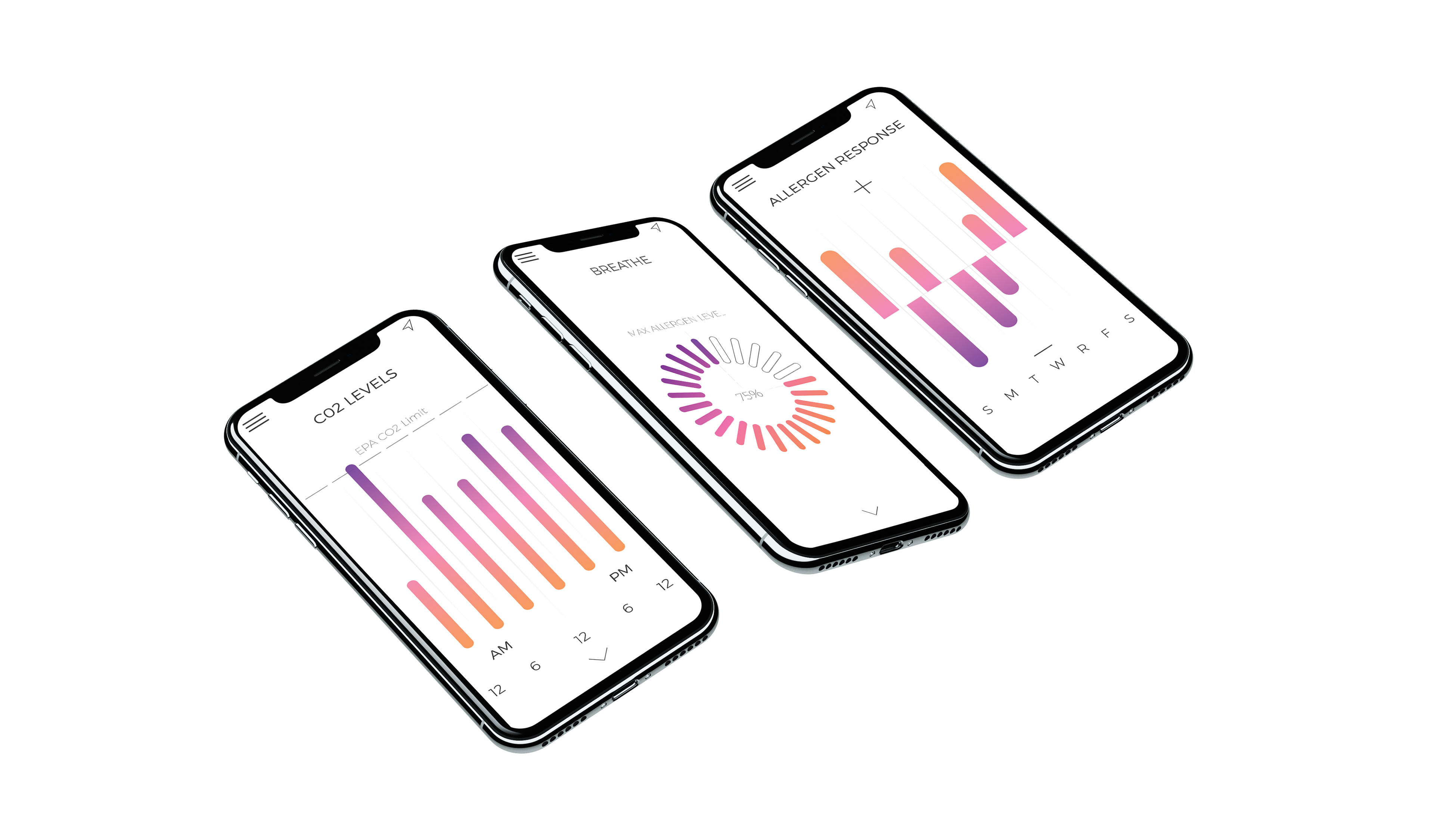 The associated Breathe app allows the user to track the effects of airborne pollutants and allergens on their health. The home page shows the user their max threshold limit, which can indicate when they are likely to have asthma and or allergy attacks. All the data is graphed for the user to analyses and track over time.