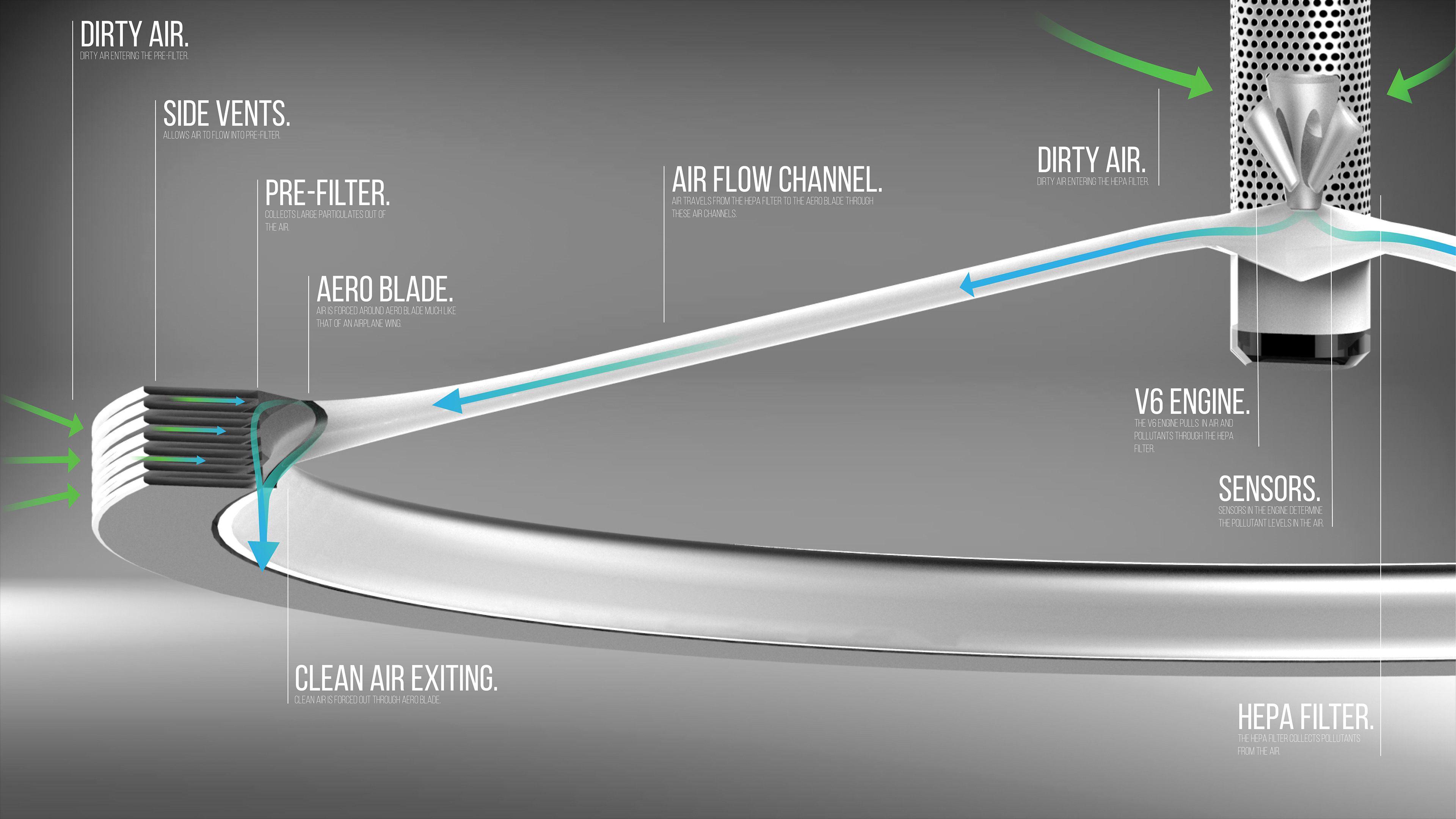Breathe’s V6 engine pulls in air through the HEPA filter and then through the air flow channels. The filtered air is then forced over the aero blade. Air is pushed around two different paths of the aero blade which result in a difference of pressure forcing air downwards. There is also a secondary foam filter that filters out larger particulates. This allows for longer HEPA filter run times, which are costly to replace.